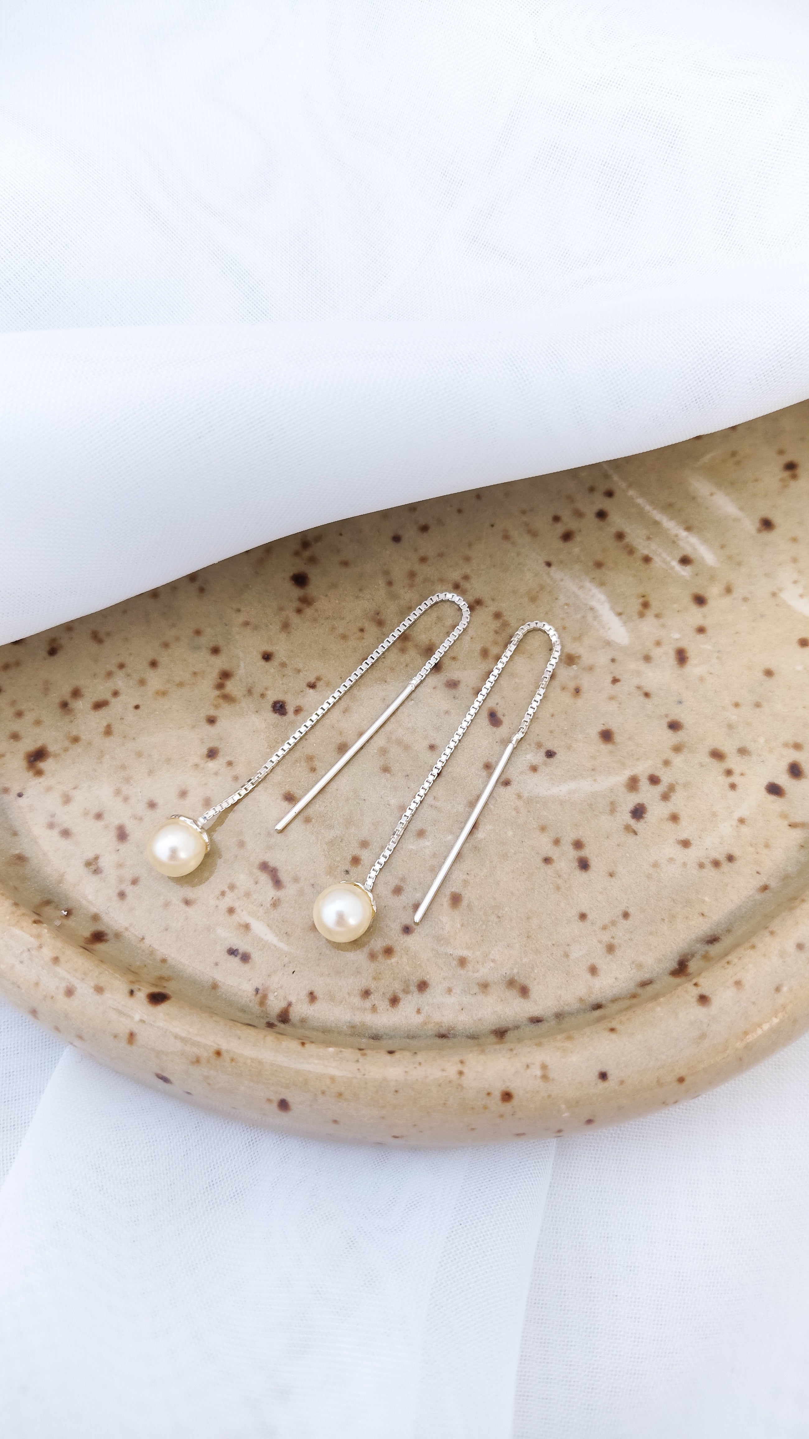 A pérola, suave e luminosa, repousa na ponta, movendo-se com a graça de uma onda que encontra sua própria cadência. Cada gesto faz a corrente desenhar no ar um traço de elegância, um brilho quase líquido que acompanha o rosto com leveza. É uma joia que une movimento e serenidade: a prata que flui, a pérola que ilumina, e o encanto que surge no intervalo entre um passo e outro