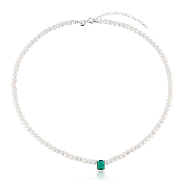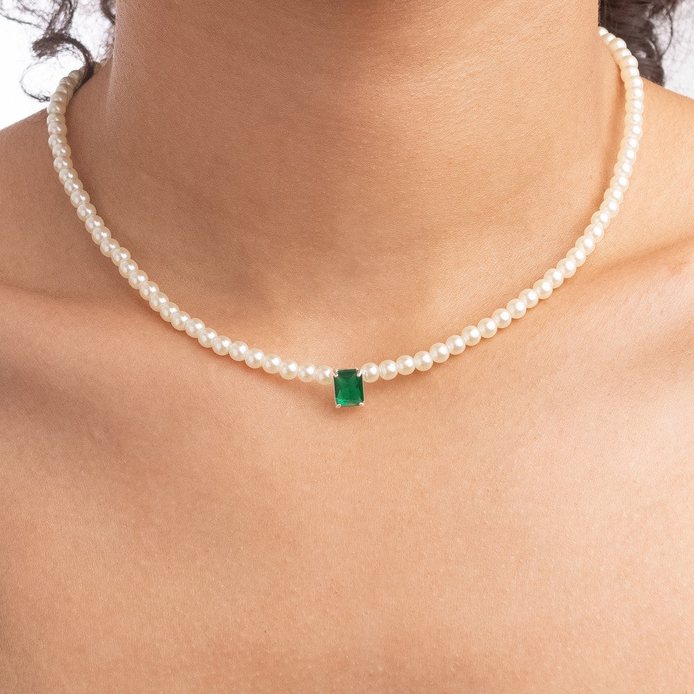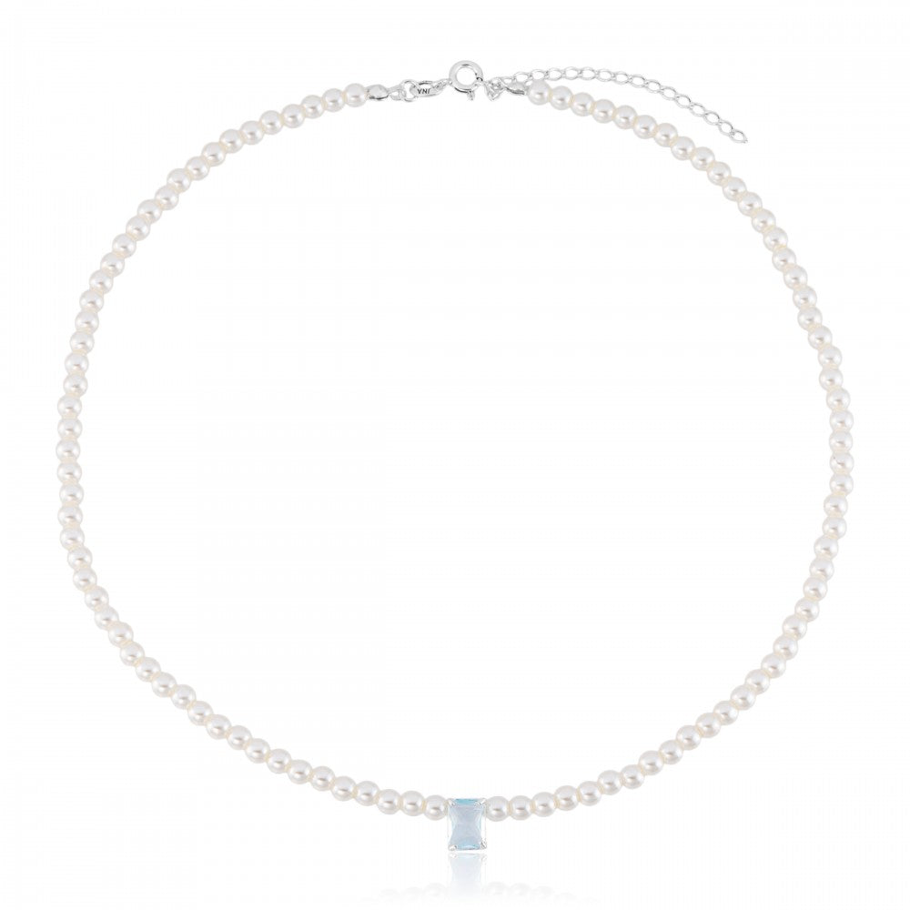 Gargantilha em Prata 925 Perolas e Pedra Retangular